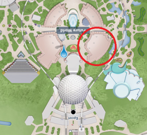 Here is a map that shows where Innoventions West is. I know it’s upside down, but this shows the side it would be on if you were walking into Epcot from the front entrance. Innoventions West would be towards the right, after you pass Spaceship Earth.