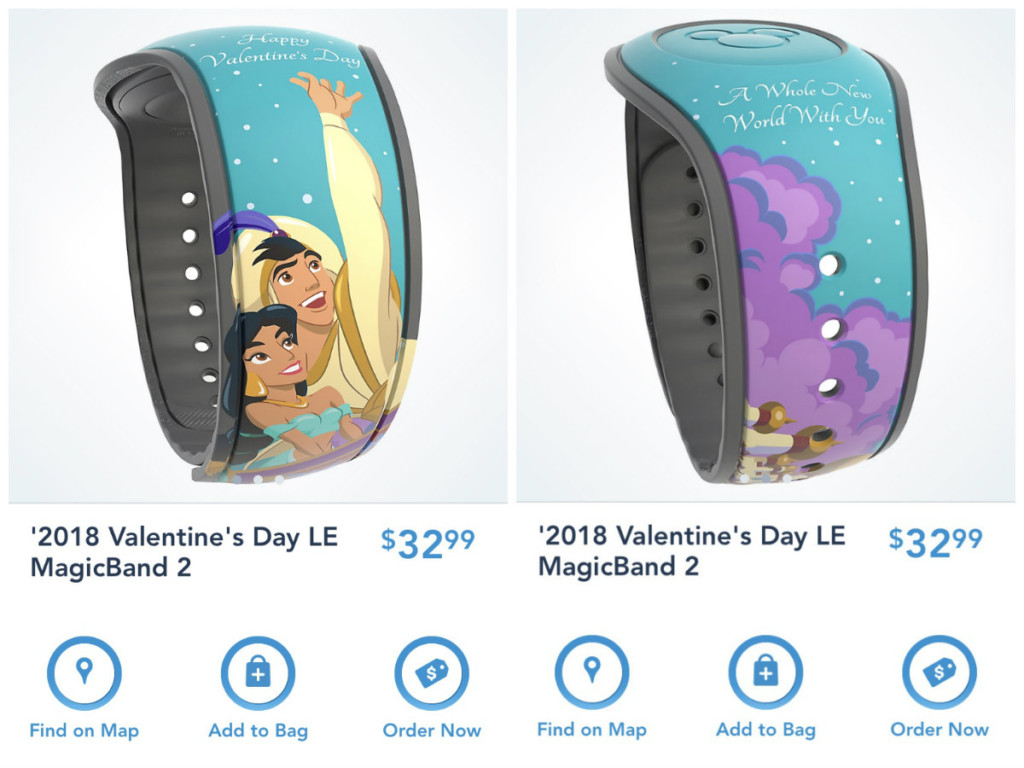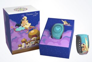 The band is a very pretty teal color and people are now wondering when a solid teal MagicBand will be released (no word yet). On one side of the band are Aladdin and Jasmine riding on the Magic Carpet with Aladdin pointing to the sky where it says “Happy Valentine’s Day.” On the other side of the band is the palace with purple clouds behind it and it says “A Whole New World With You.” It’s so cute!
