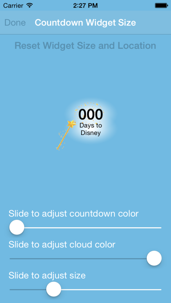 App 4 Published March 17, 2015 - size: 577 × 1024 in Countdown for Disney App ← Previous Next → You can now customize the Countdown Widget with size, color, and location. Continue Reading... Customize the Countdown Widget.
