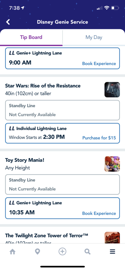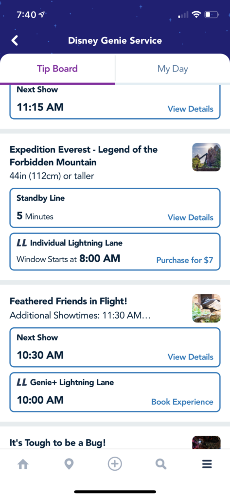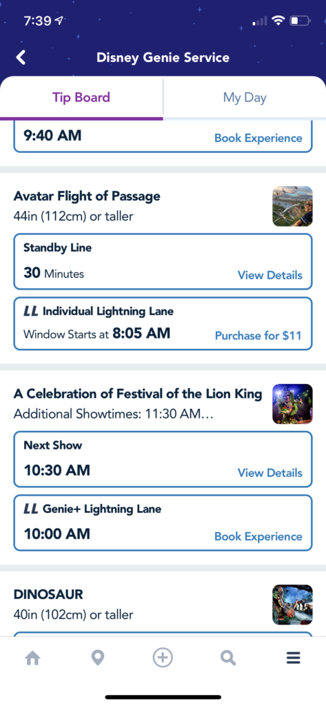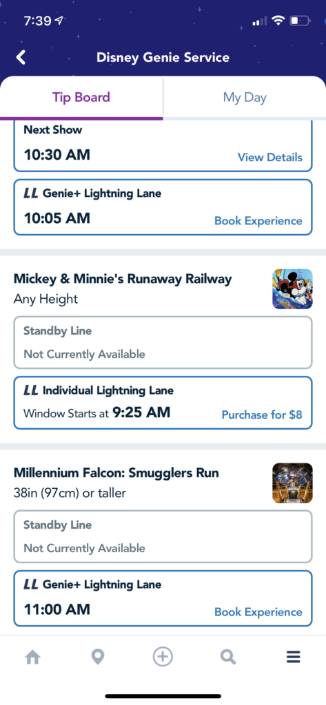 More options are available when a Walt Disney World Resort hotel reservation is linked to the account, but there are things everyone can see. I don’t have a hotel reservation booked right now, but I could play around with it a little bit. From what I could explore with this new feature it looks like it’s got some helpful things. The tip board will let you know when the next Genie+ Lightning Lane window is available for each ride. It also lets you know the cost for the Individual Lightning Lane rides. The prices seem to range from $7 to $15 depending on the ride.