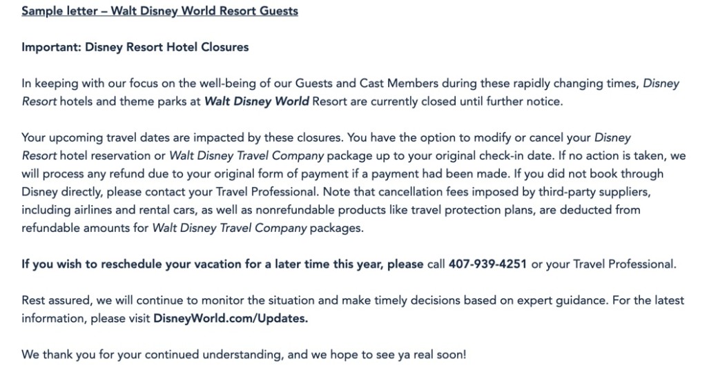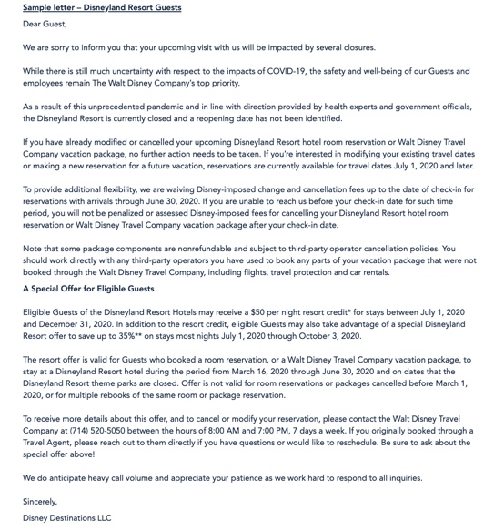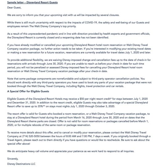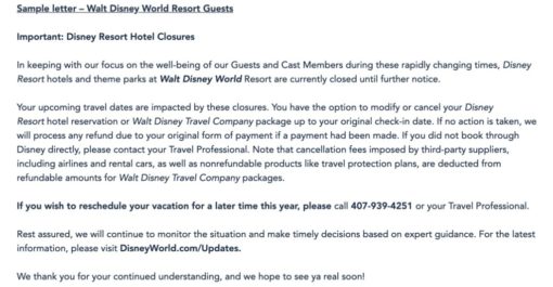 Disney has started emailing guests with Walt Disney World Resort and Disneyland reservations that begin between May 31 and June 6, 2020 stating they need to modify or change their dates. The letter that went out to guests explains that these are “rapidly changing times” and that Disney is focused on the safety of guests and cast members.