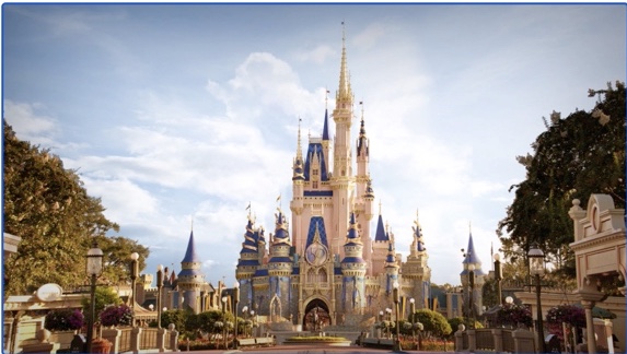 Decorations were the topic of the news today, along with a newly coined word from Disney … “EARidescence,” which refers to the sparkle that guests will see with these decorations. To start, Cinderella Castle at Magic Kingdom will get an additional makeover, with gold bunting and a 50th anniversary crest. However, the castle isn’t the only park icon receiving some extra touches later this year.