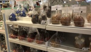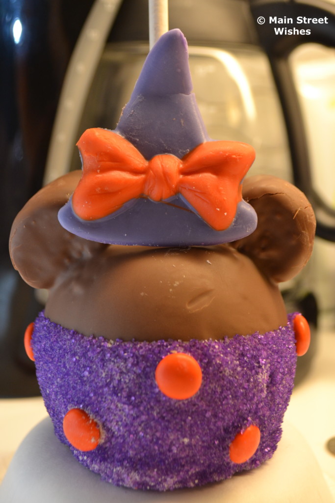Right now, there are some Halloween themed apples, in addition to the regular candy apple designs. In various stores on Disney World property guests can find themed apples like a pumpkin Mickey, a Minnie witch, and the ghost Mickey apple.