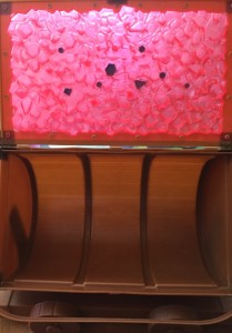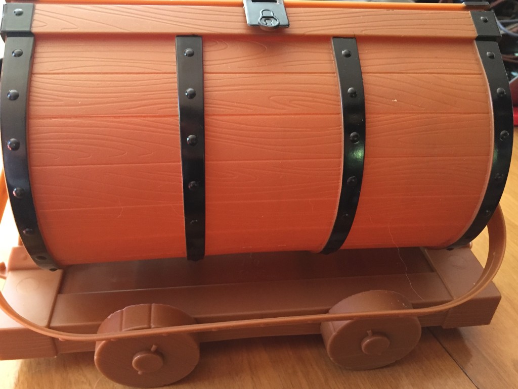 It’s a really cute popcorn bucket though. The wheels move on this bucket too and they feel sturdier than the wheels on the Cinderella bucket. This one has a handle instead of a strap. You can’t put it over your shoulder, but the handle makes it easier to carry. I actually put this one in the basket below our stroller. Since it felt sturdier than the Cinderella bucket, I wasn’t afraid it was going to break. The Mine Train buckets can also be connected to each other. There is a loop on one side and a peg on the other side, which allows them to latch together.