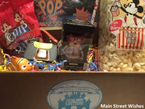 Was I happy with what I received? Absolutely. In the box was a big bag of kettle corn, roasted almonds, a Vinylmation, a Pop Century post card, a key chain, a Finding Nemo magnet, and a Mickey pencil.