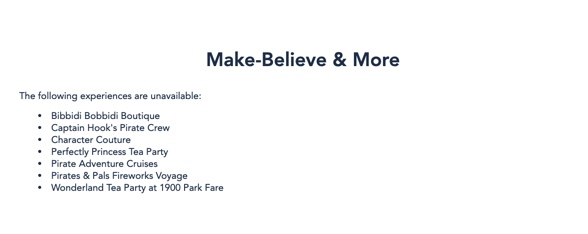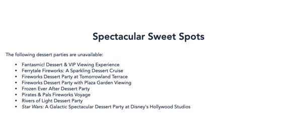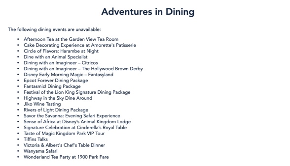 There are obvious things on the list, like the fireworks dessert parties, but then there are things like Afternoon Tea at the Garden View Tea Room that might come as a surprise. Take a look at the list below to see if something you have scheduled is on there. If it is, don’t worry. Disney will be issuing refunds to those that have paid already.