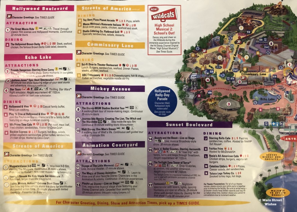 When the guide map is open you can see how different Hollywood Studios looks now. There’s mention of the “new” High School Musical 2: School’s Out show and the Hollywood Holly-Day Parade (the dotted line was the parade route). Under Sunset Boulevard you’ll notice that McDonald’s still had a presence in the park at this time, with Fairfax Fries where guests could get McDonald’s french fries.