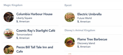 The two new restaurants added are Columbia Harbour House in Magic Kingdom and the Electric Umbrella in Epcot. In total there are now 11 restaurants on the list. Magic Kingdom has five, Epcot has one, Animal Kingdom has four, and Disney Springs has one.