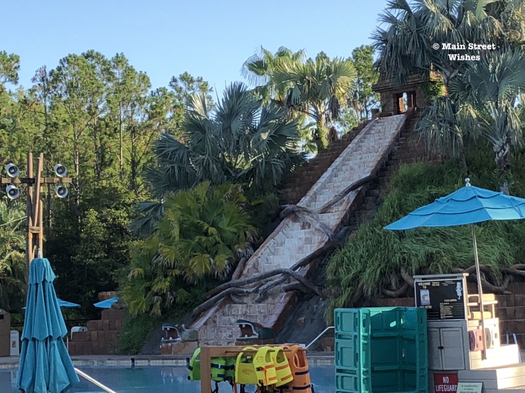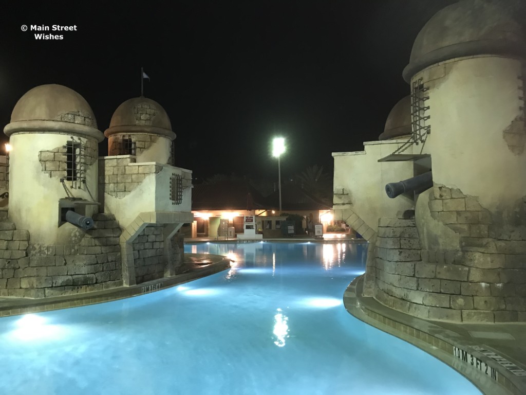 The main pools at the Moderate Resorts are all designed to the theme of the resort. The main pool at Port Orleans-Riverside is designed to be like an old fashioned swimmin’ hole, Port Orleans-French Quarter keeps the Mardi Gras theme going at the main pool, Caribbean Beach Resort is themed after a old Spanish fortress, and Coronado Springs Resort has a 50 foot replica of a Mayan Pyramid.