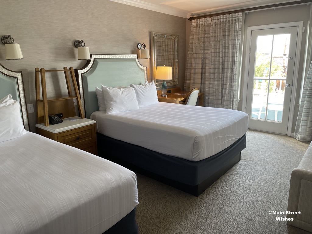 The rooms that are available at the deluxe level offer you a choice of a studio, one bedroom suite, or 2 bedroom suite. The studios are set up like the studios at the moderates. They have 2 queen beds, television, dresser, closet area, sink/vanity, and the tub/shower and toilet (separate from the sink/vanity). The rooms at each of the resorts may vary with what type of beds are offered. Some, like the Beach Club, have a daybed, so the studios can sleep five people. Each of these room types have different views available for different costs.