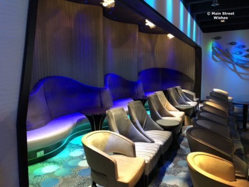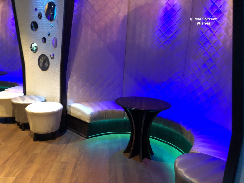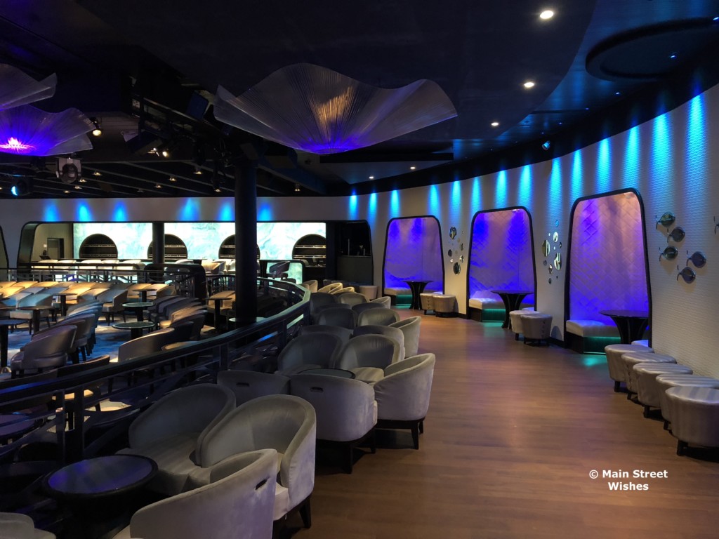After checking out the lobby we started the tour by getting a peak inside the After Hours pubs and nightclubs. The ship has some great choices for adults to grab a drink enjoying different entertainment. The first place we saw was Fathoms. I loved the benches and tables set inside the wall and the colors in this venue. In addition to the seating on back wall there is plenty of seating throughout the whole club. All the seating faces the stage at the front of the room where entertainers perform nightly. There are signature drinks available with fun ocean themes to the names, including Blue Tang, Anemone, and the Black Pearl.