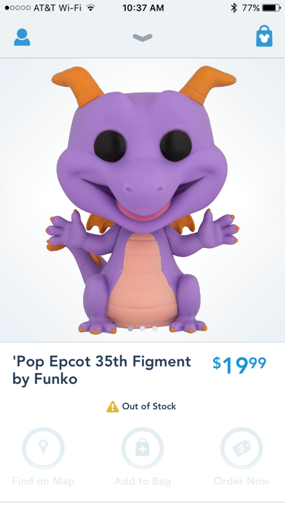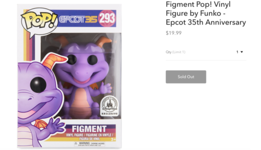 This adorable Pop! was available on both the shopDisney.com website and on the Shop Disney Parks app. The cost is $19.99, plus shipping and handling. Unfortunately, but not surprisingly, it did not take long for both to become sold out of Figment. I’m not sure if Disney will be getting more or if once they are gone, they’re gone. Guests may have more luck in Epcot than online, but not everyone is able to get to Epcot.