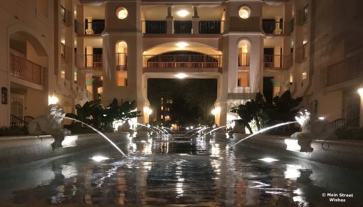 My favorite fountain was actually not far from my room in Casitas Building 3. It’s a long fountain with lions on either side spouting water into the fountain. During the day it’s nice to look at, but at night it is lit up and is really pretty. Each night when I returned to the resort I loved walking by that fountain. Not only is it pretty to look at, but the noise of the water is relaxing. When you walk by on a quiet night the only thing you can hear is the water running into the fountain. It’s a peaceful way to help end a busy Disney day.