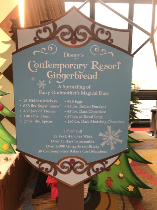 The gingerbread display at the Contemporary Resort is up and finished. It’s Cinderella Castle with Cinderella, Prince Charming, and the Fairy Godmother standing in front of the castle. The display is designed after the Mary Blair art that is in the Contemporary Resort. Another cool thing that Disney does is they put the amount of ingredients used. While this may not sound too interesting at first, keep in mind these displays are huge, and in turn so are the ingredient lists. For instance, 428 eggs were used to make the Cinderella Castle gingerbread display. That’s a lot of eggs from a lot of chickens.