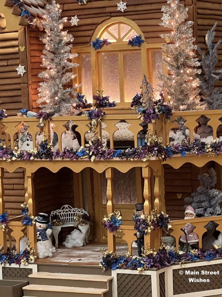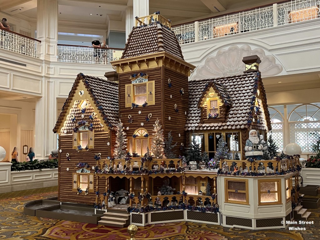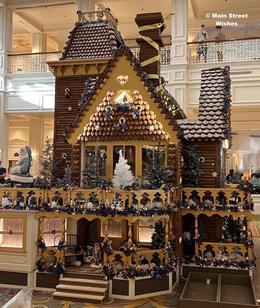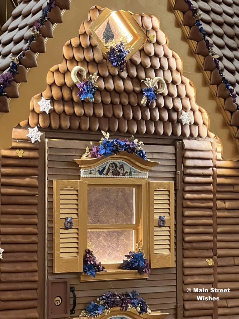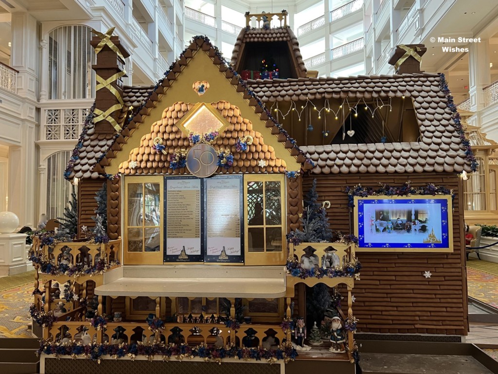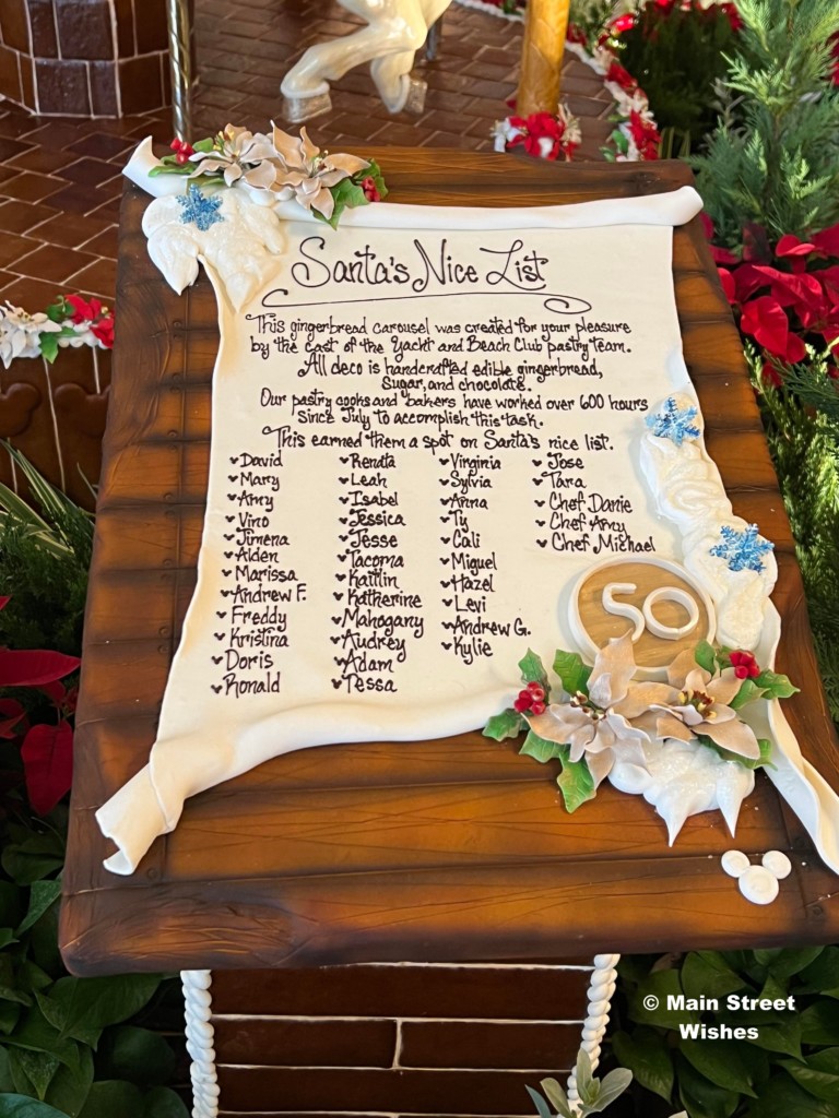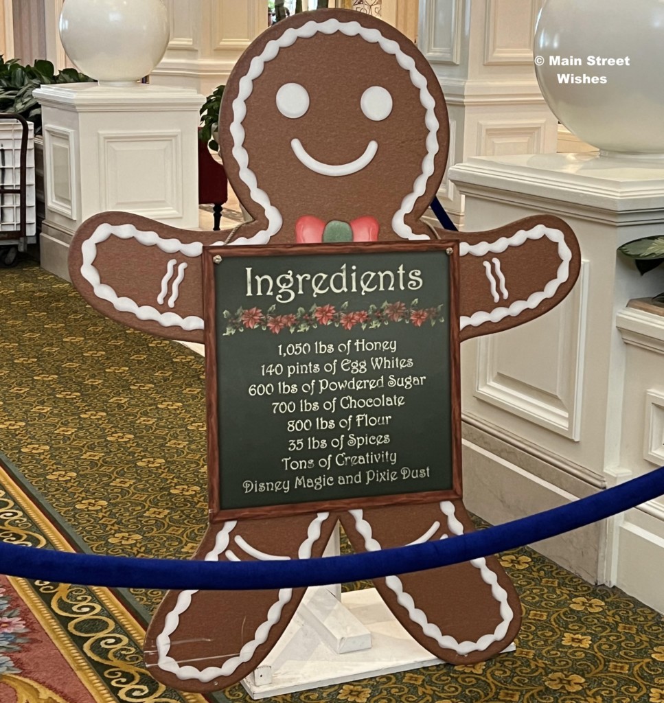 The Grand Floridian is probably the most popular gingerbread display, because there is a shop inside the gingerbread house. Guests can line up by the counter and put in orders for certain things sold at this location. In addition to the shop, the details on this house are amazing. The bakery team at Disney World pays close attention to the details, from the porch down to the 50th anniversary touches, it’s worth it to take the time to look at all sides of this display to see all the details. While looking at the details, make sure to look at the gingerbread sign. This sign tells you all the ingredients used and how much of each ingredient. It’s interesting to see how much it takes to make the display.