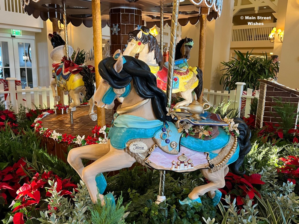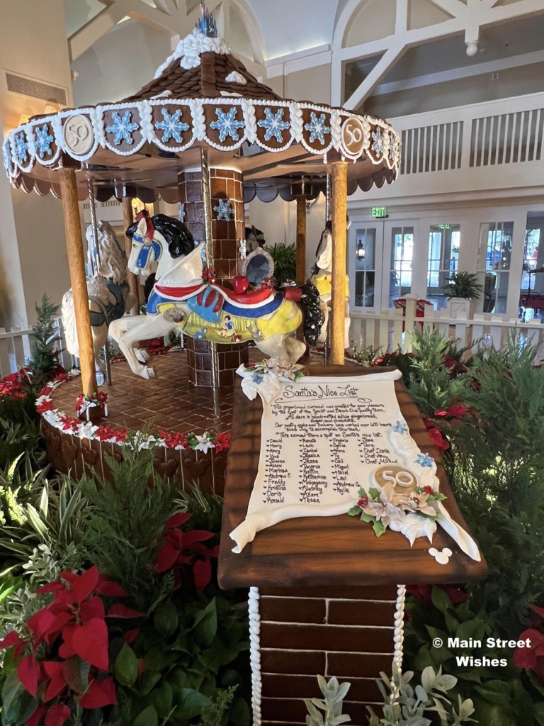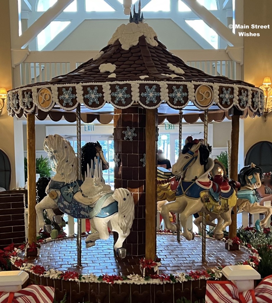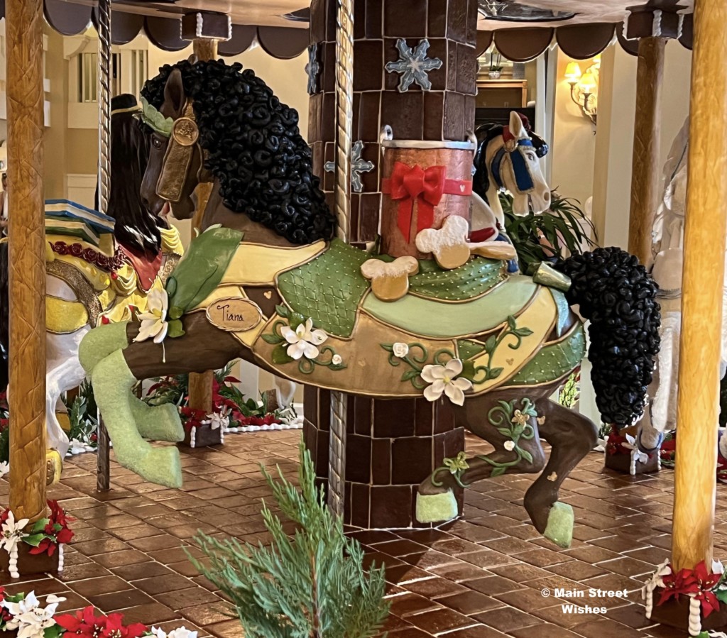 Another gingerbread display to stop by and see is the carousel at Disney’s Beach Club Resort. Not only are the horses detailed, but the carousel actually spins! Each year the horses have a theme and this year they are themed after Disney Princesses. Just like the gingerbread house, the carousel also has a list of ingredients by the display, so make sure to take a look at that while visiting.