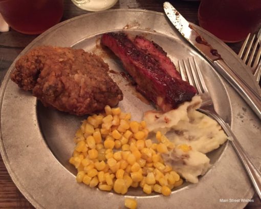 The restaurant is all-you-care-to-enjoy and family style. That means you share the food with everyone at the table and you can get as much as you want of each item served. On the menu is cornbread, salad, fried chicken, ribs, seasonal vegetables (corn for us), mashed potatoes, and baked beans for dinner and strawberry shortcake for dessert. The chicken and ribs came in fun buckets that our waiter liked to slam on the table. The place settings fit the theme of the restaurant too.