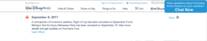 Disney has also added a chat option, which shows in the upper right corner. Guests with concerns about the hurricane can use this chat option to get answers to their questions and concerns. Disney is keeping some updates available on their homepage as well, but you can get the full update on their Information on Hurricane Irma page to see all of the closures and cancellations.
