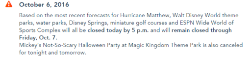 You know things are bad when Disney starts closing their parks. I have heard that they are offering full refunds for those that have tickets for the cancelled Halloween parties. So if you have a ticket for tonight or tomorrow night make sure to call Disney and see about a refund.