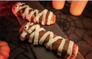 - MMMummy Treat: Flaky pastry filled with chocolate-hazelnut filling and topped with white icing stripes and sugar eyes. (Available during the party only)