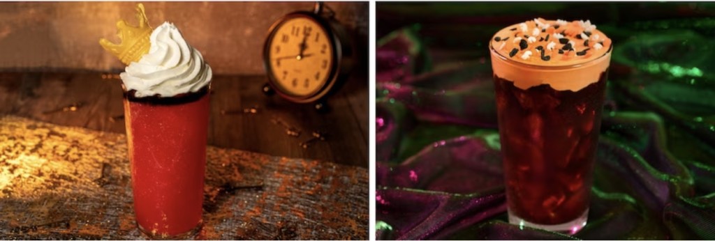 - Queen of Hearts Slushy: Frozen cherry slushy drizzled with black cherry purée and topped with whipped cream and a crown-shaped chocolate piece (Non-alcoholic) (Available during regular park hours and at the party)