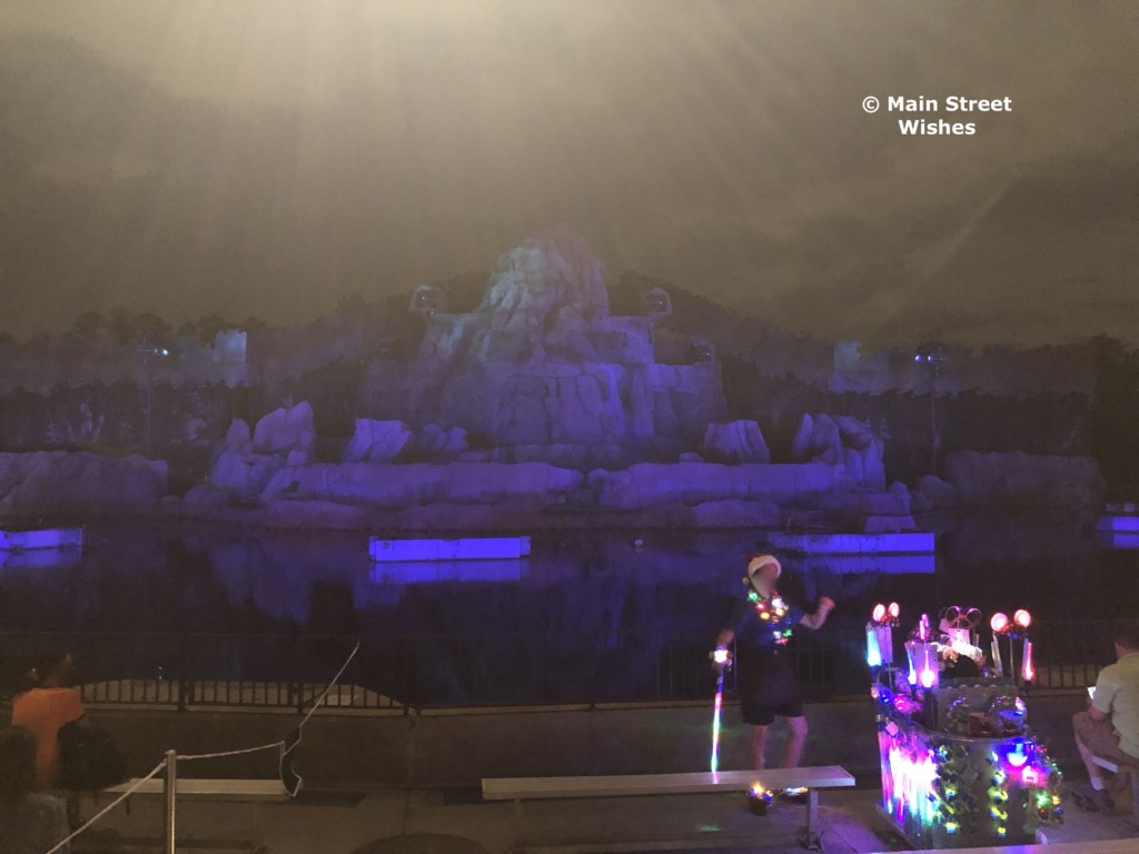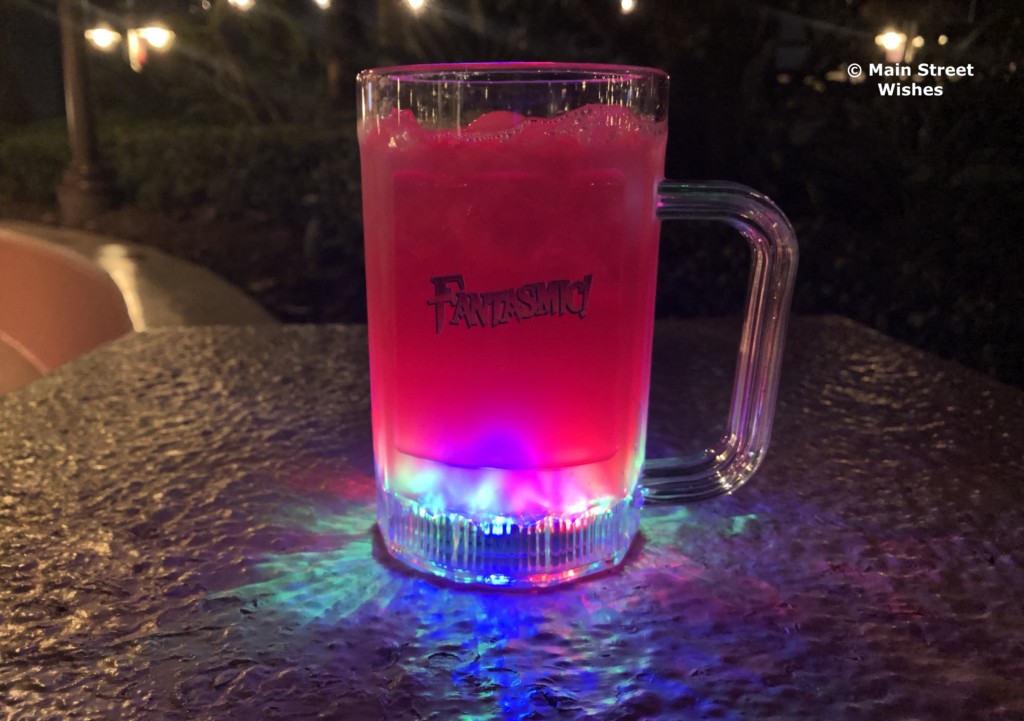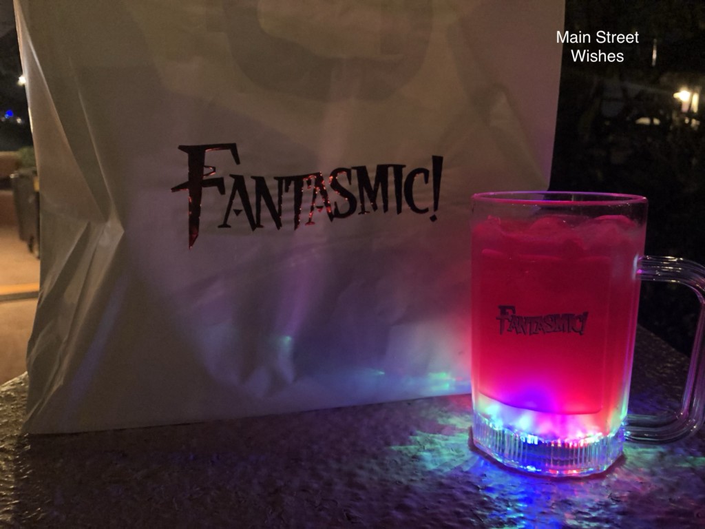 Once you get through the touchpoint area you will make your way to the stand for your food and drink. The Cast Members move quick and have the food and drink distribution down to a quick moving pace, so you won’t be waiting in line long. First you will get your food and a bottle of water, which will be in a bag that says Fantasmic! on it. The bag is pretty durable, so you don’t have to worry about it breaking as you make your way to your seat. After you get your food, the next stop is your drink. Guests have a choice between an alcoholic and nonalcoholic drink. The night I went, the alcoholic drink was a margarita and the nonalcoholic drink was a punch. The punch was on the sweet side, but it was good. There’s a fun aspect about the mug the drink comes in. The mug lights up on the bottom and illuminates your drink, making it a nice souvenir to bring home.