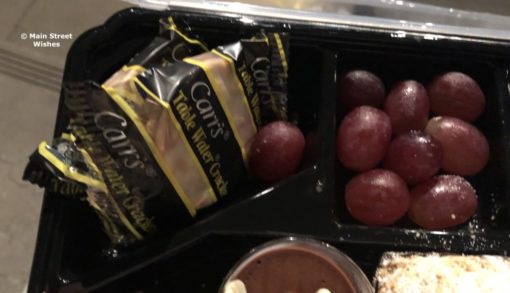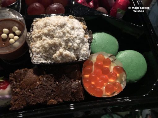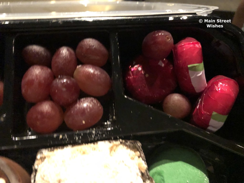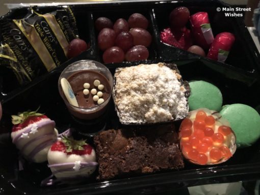 Inside the food container is a decent amount of goodies to snack on. I was a little surprised (in a good way) at the amount of food in the container, to be honest. One piece of advice I have is not to eat too close to when you are going to the party, because you probably won’t be able to finish everything. I made the mistake of having dinner at 50’s Prime Time Cafe beforehand, a little over two hours before the dessert party. Prime Time itself was not the mistake, the food there is always so good and the Cast Members are fun to interact with, I was just already pretty full from dinner there that I couldn’t eat too much.