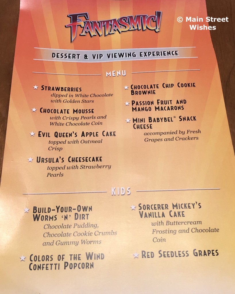 At $39 (per adult), this is one of the less expensive dessert parties. Most of the other dessert parties range from $69 to $84 dollars per adult. So the fact that it was the least expensive was a definite bonus from the start. Plus, I had not seen Fantasmic! in a while, so I was excited to get a good seat for the show.