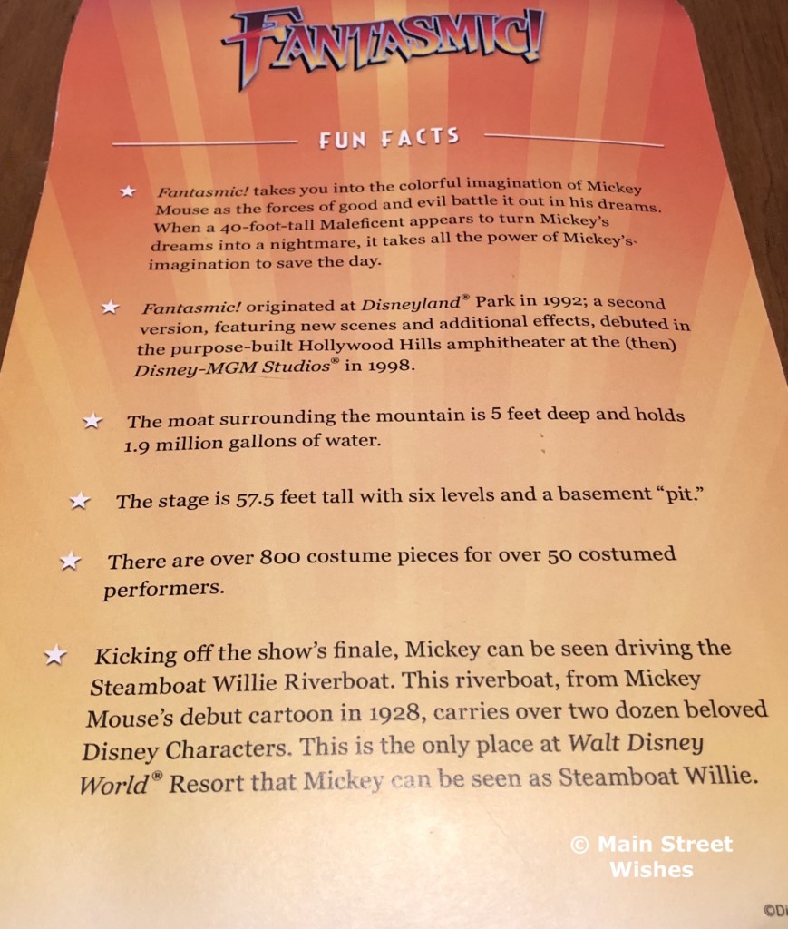 Something else that you get is a card with descriptions of each food item on one side and on the other side are fun facts about Fantasmic!, which I found interesting.