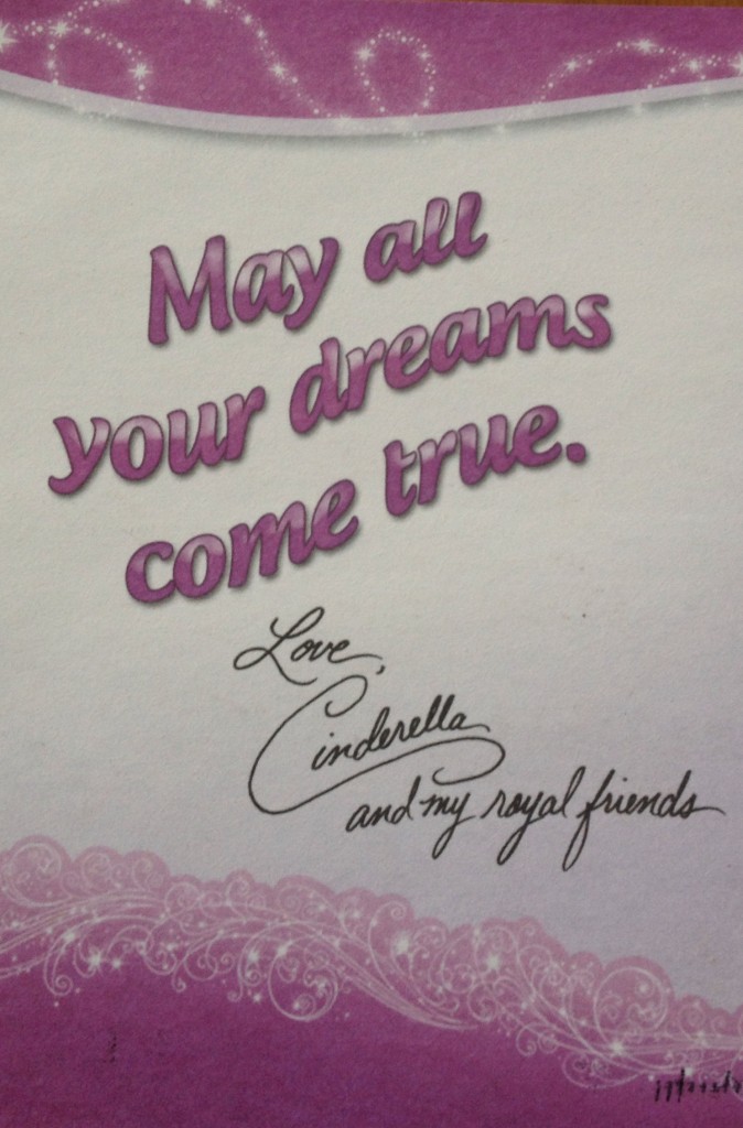 When the postcard came, it was “signed” by Ariel, Princess Tiana, Princess Jasmine, Belle, Snow White, Rapunzel, Princess Aurora, and Cinderella. On the back of the card it says “May all your dreams come true. Love, Cinderella and my royal friends.”