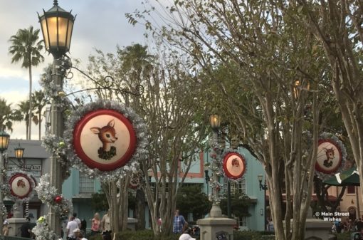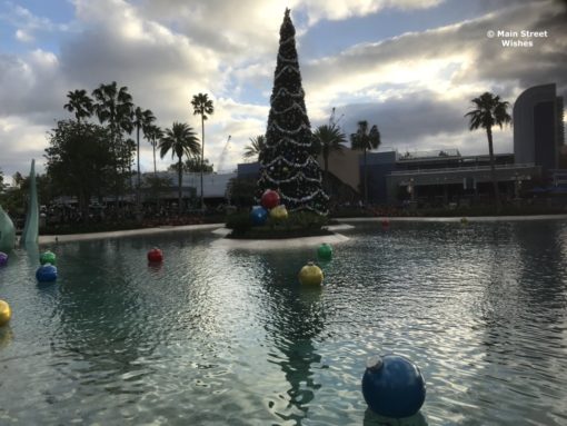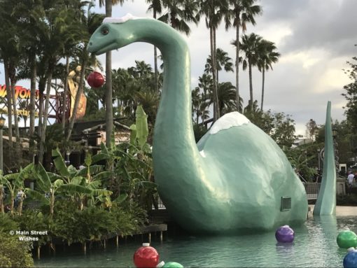 Once dinner was over, we headed outside to check out the Christmas decorations around Echo Lake. The new decorations are beautiful! It’s hard for pictures to really do it justice. We also loved that they included Gertie in the decorations, she has a Santa hat on her head and an ornament in her mouth. There are also ornaments floating in the late and a collection of three big ornaments by the big Christmas tree in the middle of the lake. The 1940s style gas light Christmas decorations are really cute too. The style reminds me of stuff that my grandmother had and I love that nostalgic feeling.