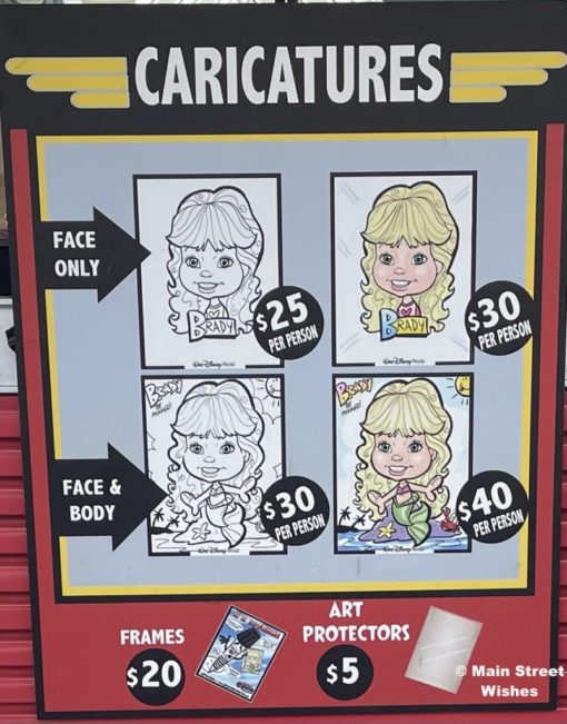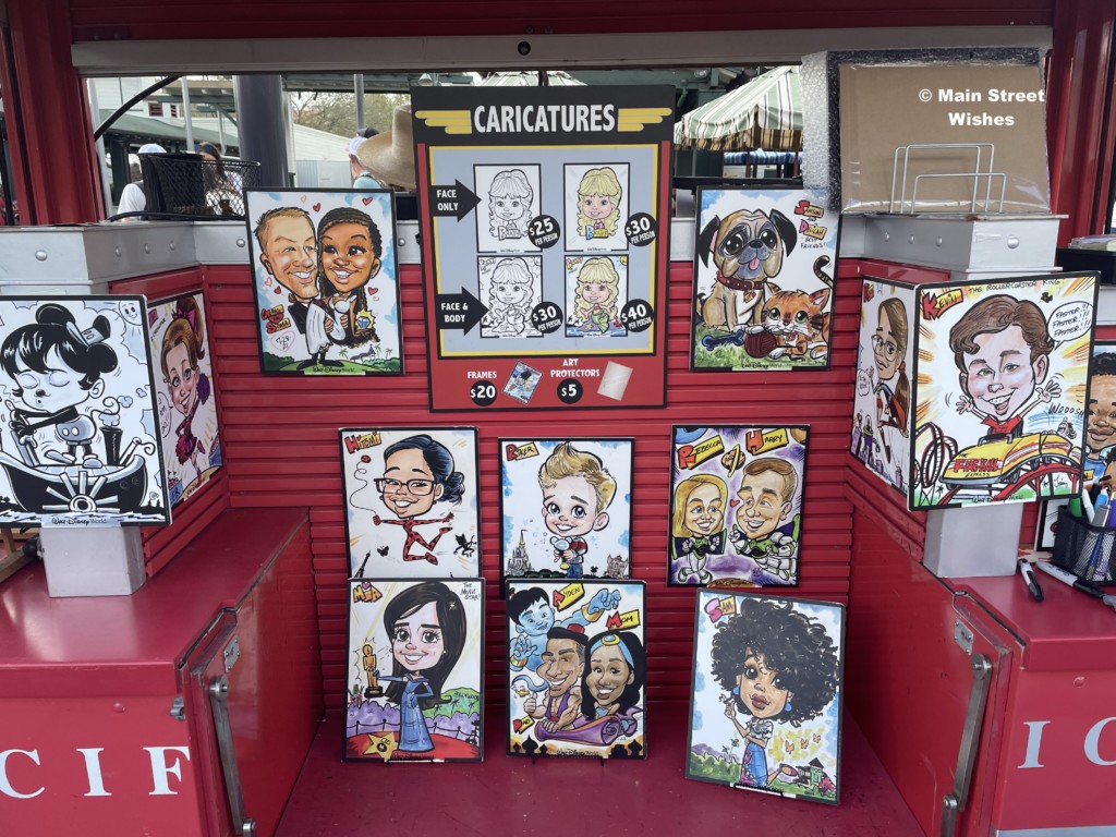 The caricature cart is located on Sunset Boulevard in Hollywood Studios. It’s easy to pass by it when you’re headed to Tower of Terror, but I recommend stopping to look a the drawings and to watch the artist as they draw new ones. It’s pretty impressive and they can pretty much draw anything (within reason, of course). I suggest taking a look at the pictures to get inspiration, unless you know what you want before going. The cart has multiple drawings on display, covering different activities, so it can be helpful to look at to get some ideas.