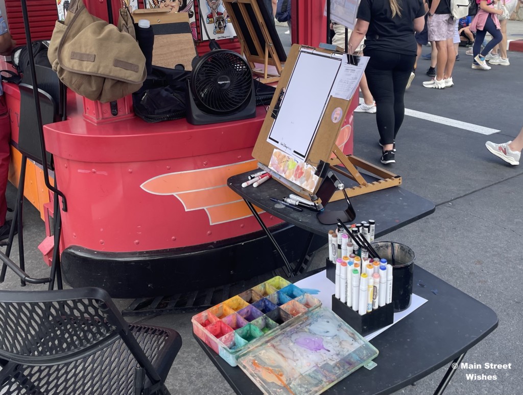 I lucked out and there was no line when I decided to get the drawings done. Most of the time people will sit for the drawings, but this was a surprise and my kids were not with me, so I was told they can do the drawings by looking at pictures. So if you are getting the caricatures for someone else, they will ask you for a couple of pictures to give the artist a good idea of what the person looks like. The best way to do it is to pick pictures that show their full face and full length of the hair.