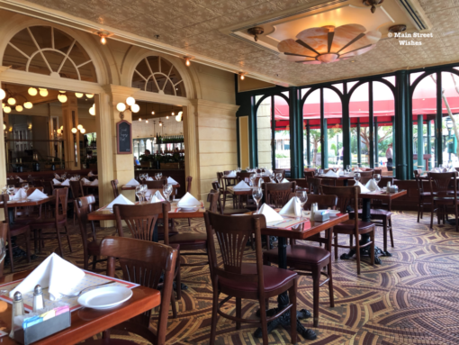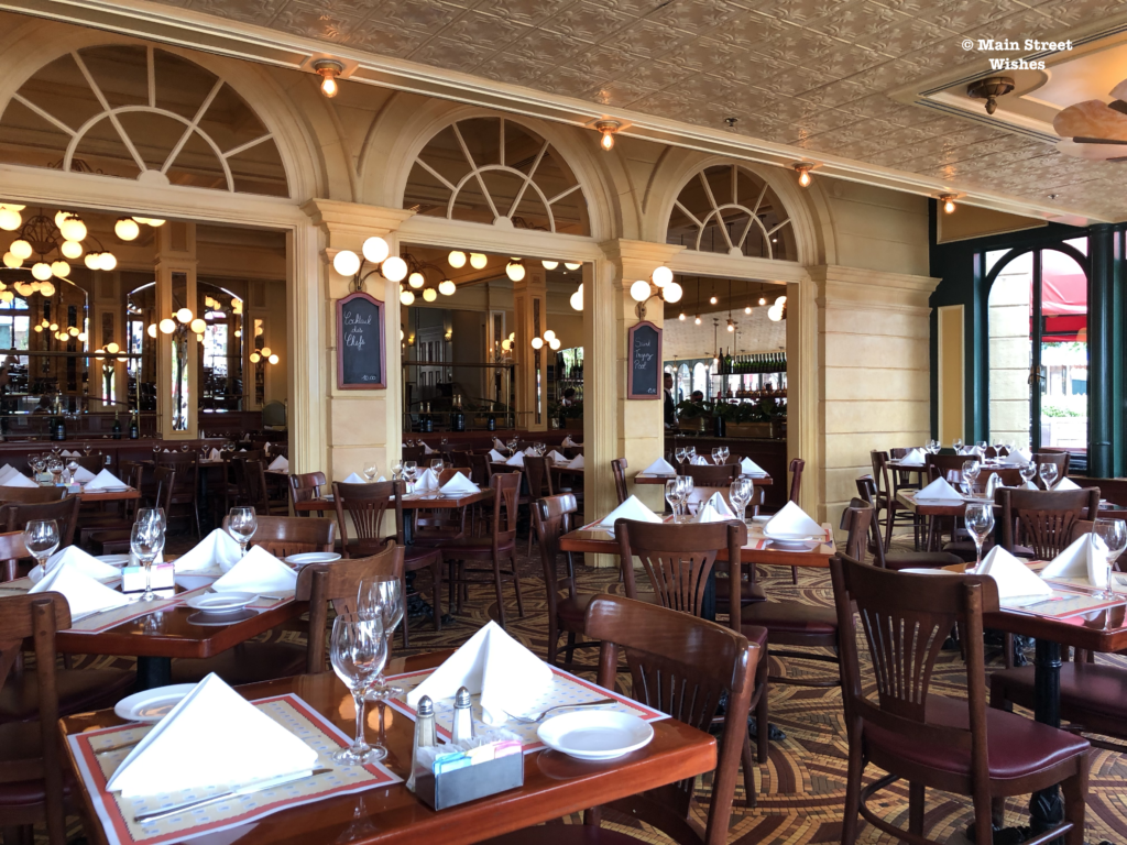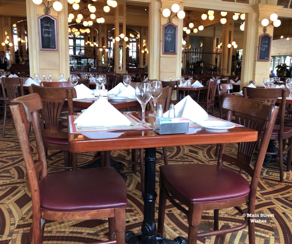 The first thing that you notice when walking up to the restaurant are the beautiful windows outlined in green that face the World Showcase. Guests seated near these windows have some nice views. The windows were designed to give the feeling of being in a Parisian brasserie. I was lucky enough to sit near one of the windows and loved being able to look out a the World Showcase while I dined. The Disney Skyliner was visible slightly through the trees and they happened to be testing them that day, so that was fun to watch while at my table.