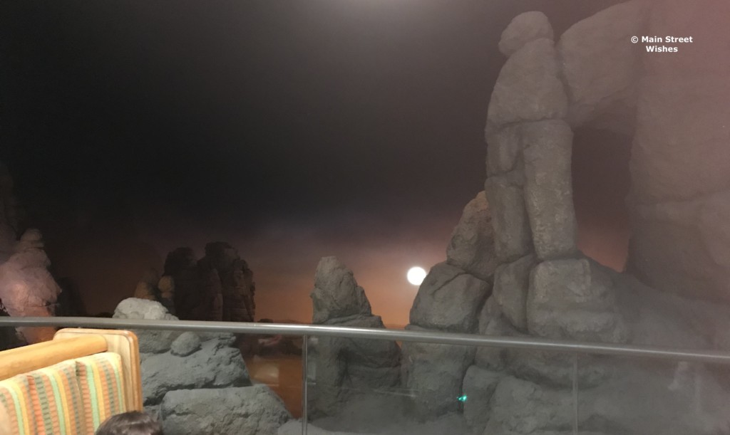 The atmosphere of the restaurant is pretty cool. The restaurant rotates, so the atmosphere is changing as the restaurant rotates. During your meal you will move past different scenes from the Living with the Land ride that is on the floor below.