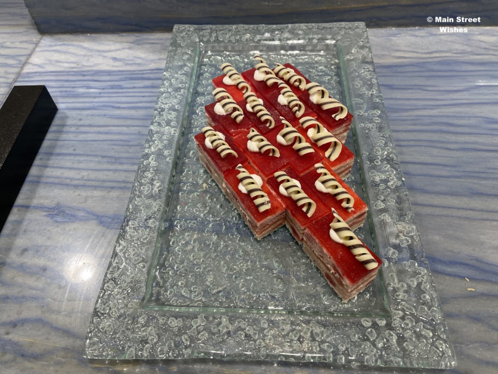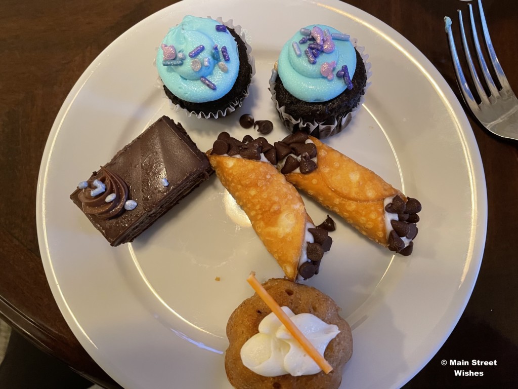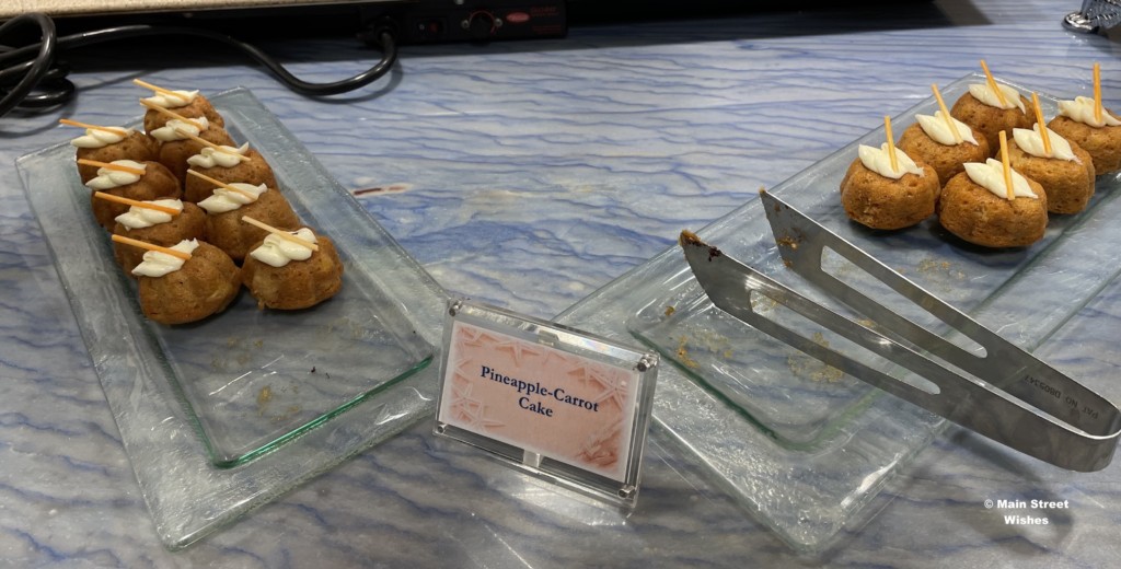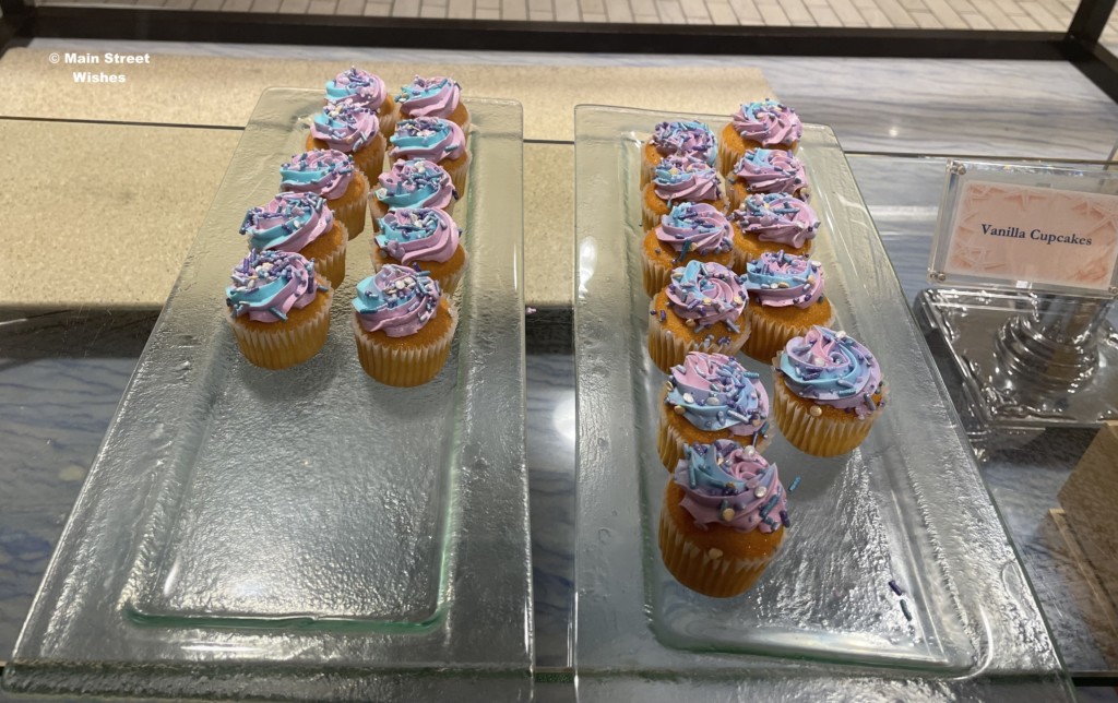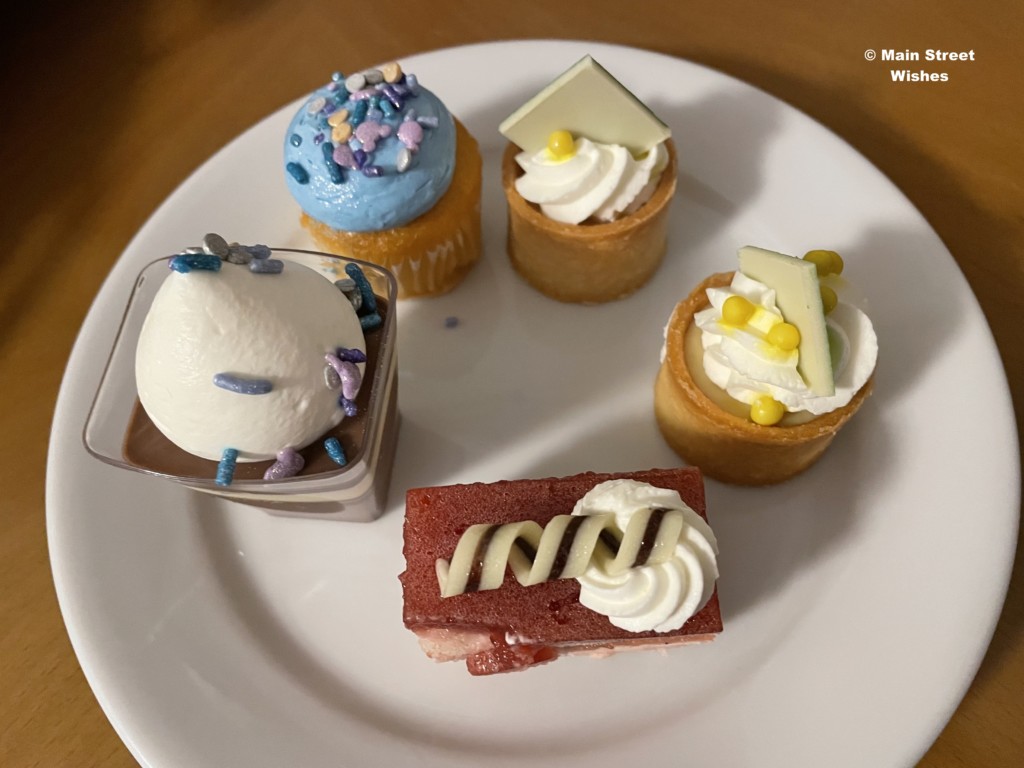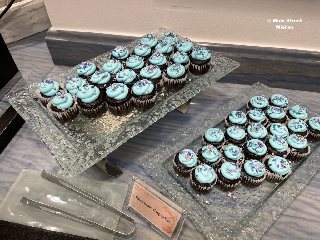During the dessert time there will be a selection of different small desserts. This is similar to what Disney serves at any of their dessert parties. There was always a nice selection of desserts each night and they even had vegan brownies available. My favorite was the key lime tart, but there were some other good ones too. The vanilla cupcake had the same frosting and toppings as some of the 50th anniversary treats.