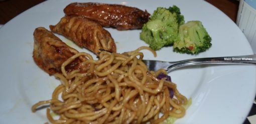 Next up was the platter with the pork dumplings that are tossed in garlic-ginger sauce, honey-coriander chicken wings, noodles tossed in teriyaki sauce, and stir fried vegetables. Oh my, this was a delicious platter. My favorite was the pork dumplings, but the noodles were pretty good too. Since it’s all-you-care-to-enjoy you can get refills of the platter, which is fantastic because those dumplings are really good.