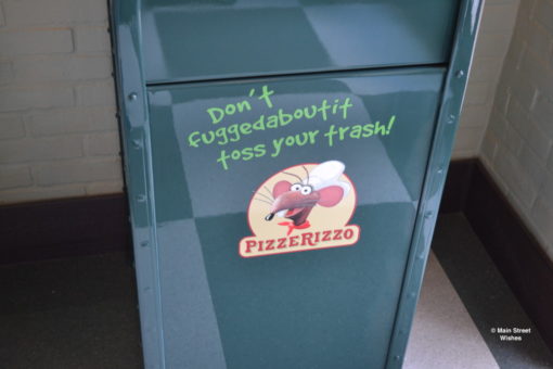 The fun Muppet theme continues when you enter the restaurant, just take a look at the garbage cans. When you enter the restaurant you will be taken past some merchandise with the PizzeRizzo logo* (mugs, t-shirts, etc.) and then you will make your way to the quick service area.