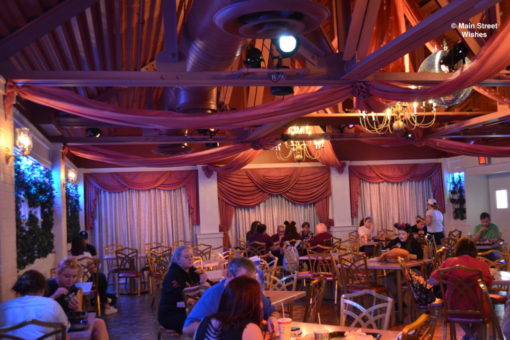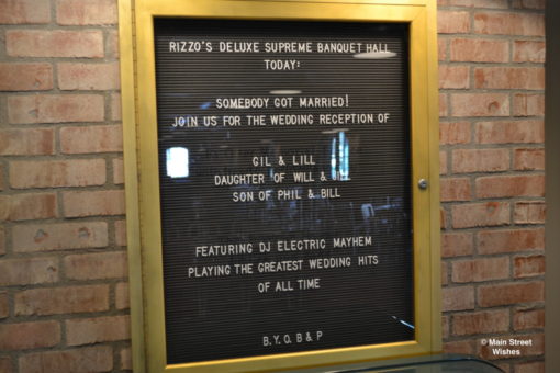 I decided to sit in the ballroom area of the restaurant. The ballroom was recommended to me by a cast member and I’m glad I took his recommendation. The ballroom is a fun room filled with wedding decorations (because Rizzo is throwing a wedding reception and you’re invited!), complete with spinning disco ball and big chandeliers. Fun music also plays while you eat. This room only has tables, no booths, but the tables and chairs look a bit more “fancy” than the other seating areas in the restaurant.