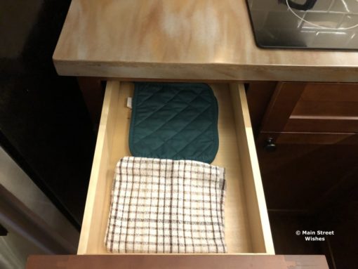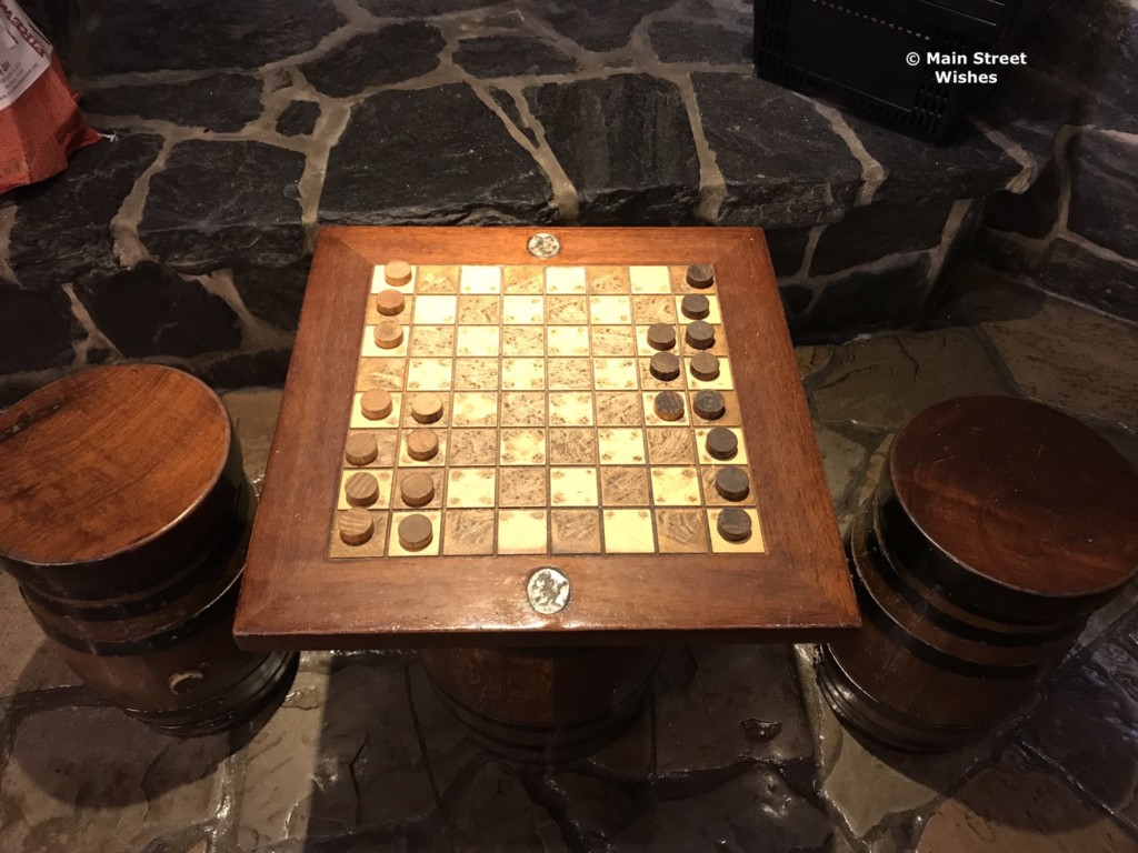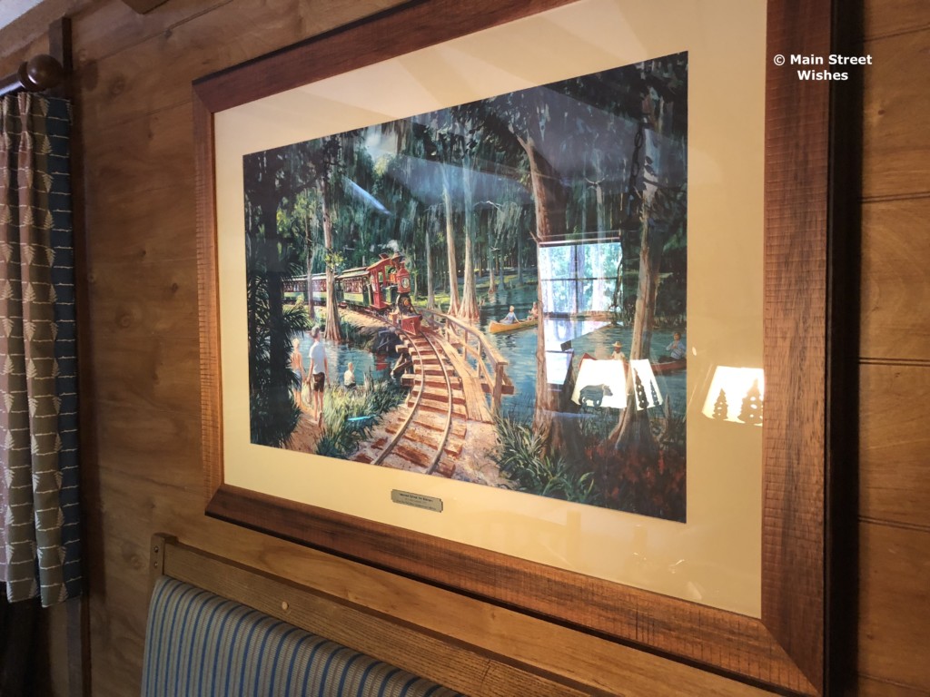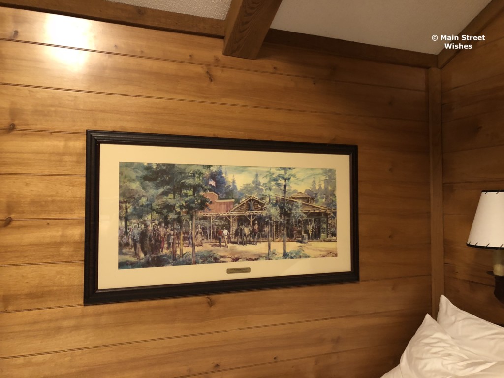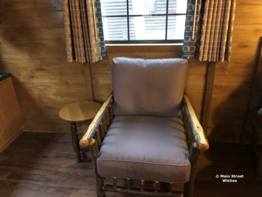 To the right of the kitchen is the living area. There is a pullout sofa in this area, in front of the big television. That setup was a big reason why the kids wanted to sleep in that area. Also in the living area is a bench/coffee table, storage space around the television, a table and chair, and a dining area with a bench seat, three chairs, and a table. There is plenty of space for everyone to sit and relax (when the pullout sofa isn’t out). A nice touch to this area is the exposed beams, which helps give it that rustic feel. I also really liked the detail on the light fixtures and the pictures that were on the walls. It all tied into the theme very well.
