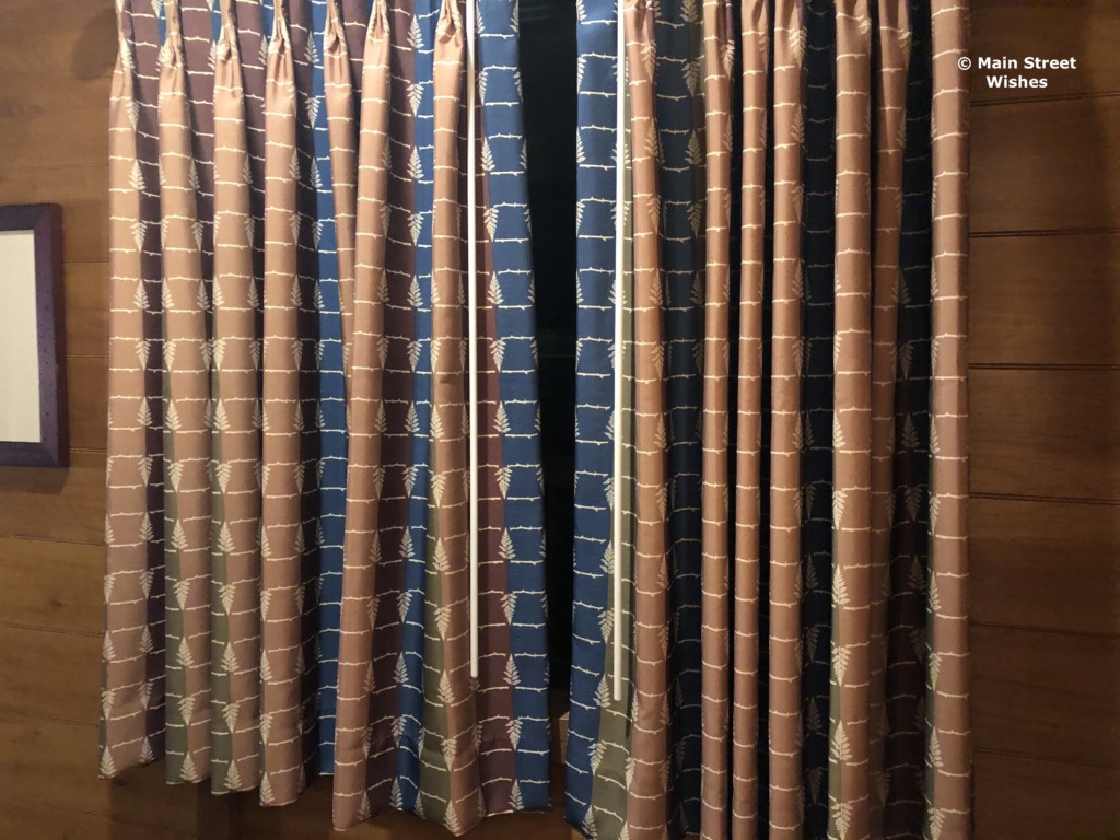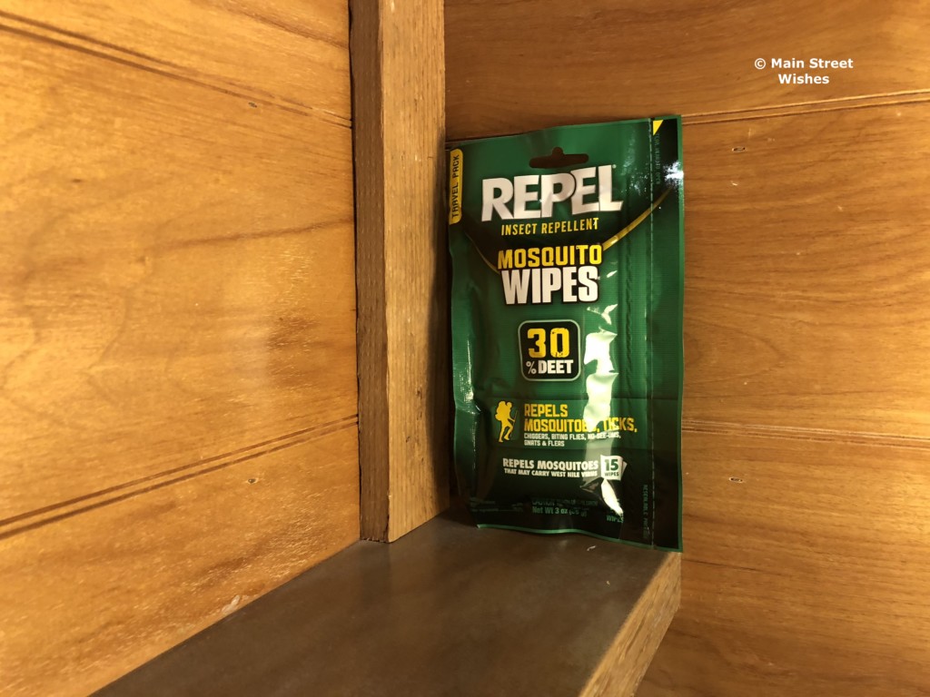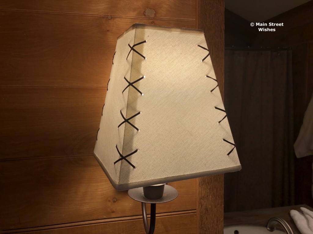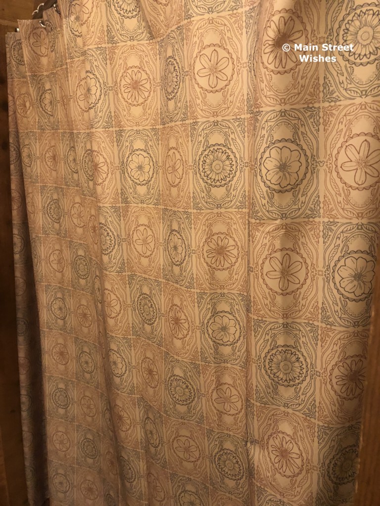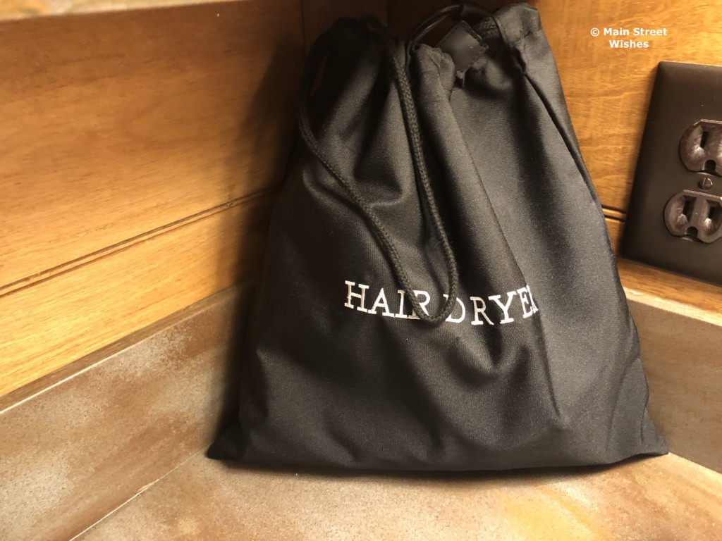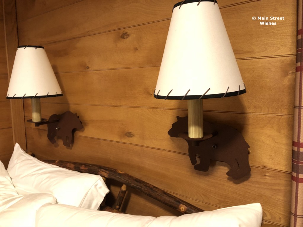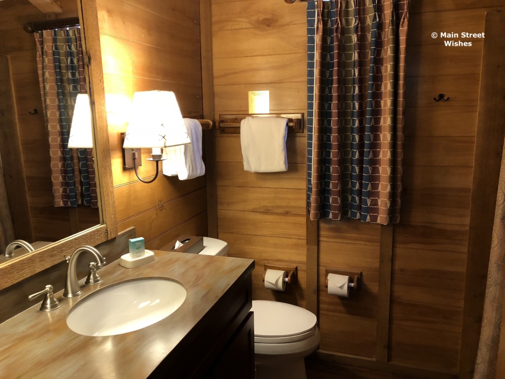 To the other side of the kitchen is a hallway that leads to the bathroom and the bedroom. The bathroom is a good size, it definitely does not have that cramped feeling that other hotel bathrooms have. The rustic theme continued into the bathroom too. There were exposed beams and the colors in the shower curtain are subdued, which matches the colors on the curtains, though they don’t have the same pattern. The bathroom came stocked with the usual Disney toiletries, a hairdryer, some mosquito repellant wipes, towels, and toilet paper. The tub/shower combination is also a good size and we found the water pressure to be pretty good.