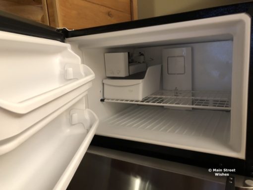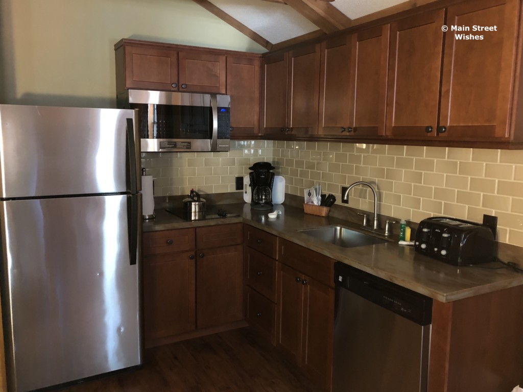 When we walked in the cabin we were greeted by a full kitchen with a full size refrigerator. I was excited to have the full size fridge, because I knew that would come in handy while we were there. The kitchen also has a dishwasher, sink, stovetop, microwave, toaster, and coffee pot. In addition, it is fully stocked with pots, pans, plates, cups, and silverware. Preparing meals at the cabin would be very easy with this full kitchen.
