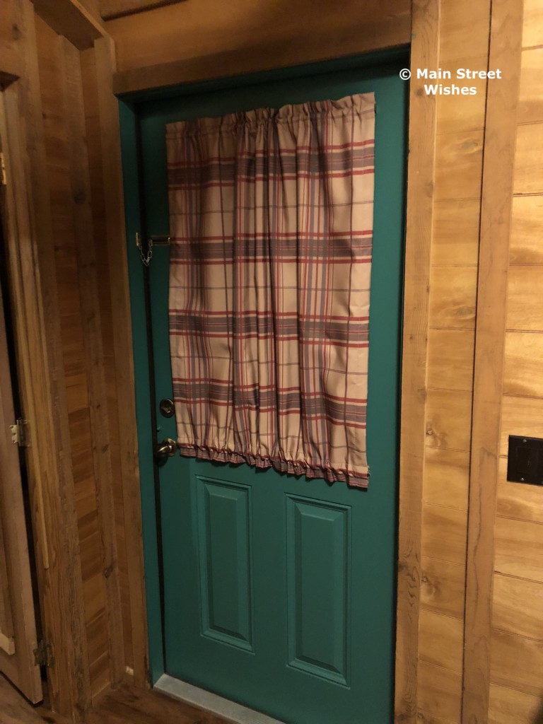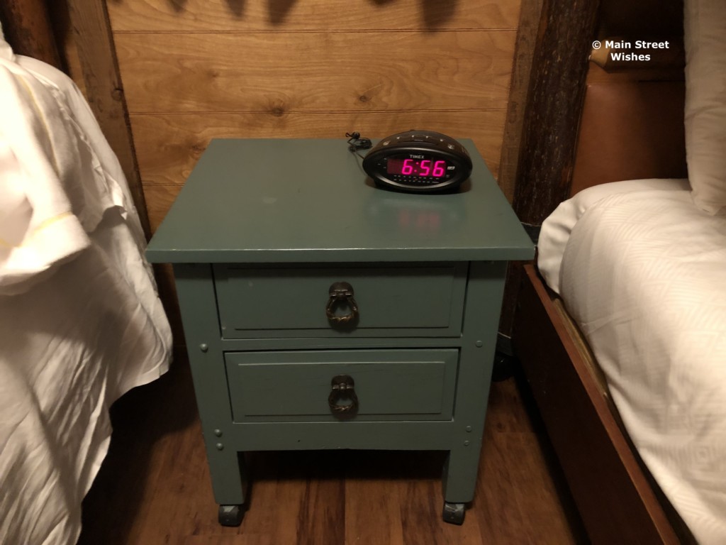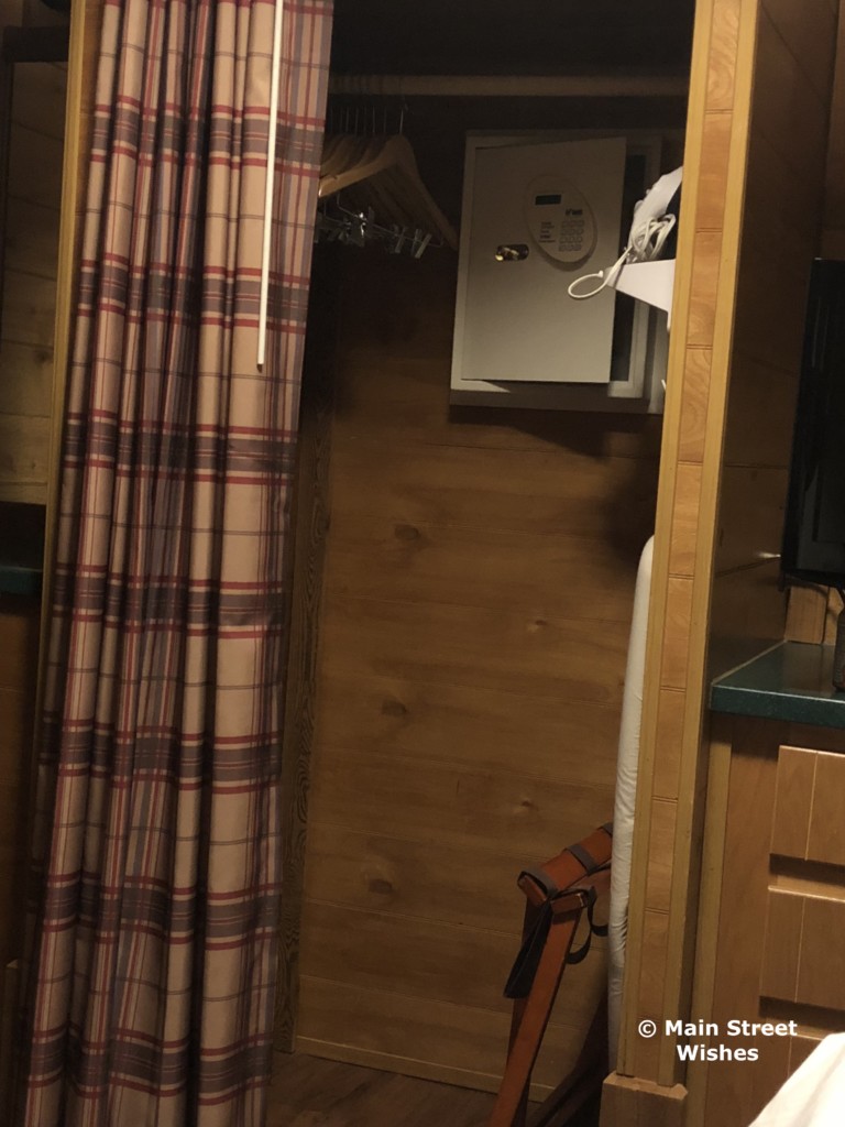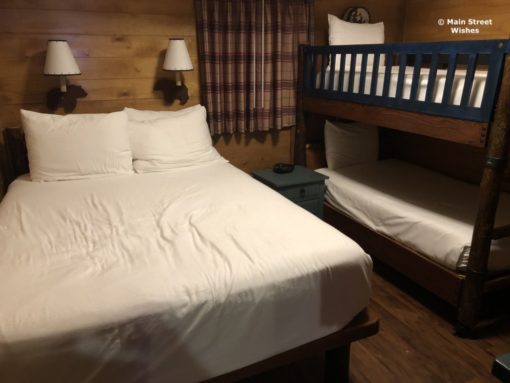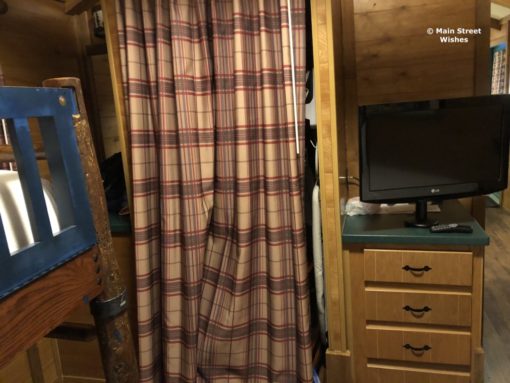 At the end of the hallway is the bedroom with a queen size bed and a bunkbed. Our kids decided to sleep in the living area with the big television, but the bunkbed adds an additional two sleeping areas for people, which is how the cabin fits six people. If people were sleeping in the queen bed and on the bunkbeds the room might feel a bit cramped. It’s a good size, but not huge. In addition to the beds there is a nightstand with an alarm clock, a closet (which has an iron, an ironing board, and the safe), a television, a small dresser on one side of the closet and a shelf with a mirror on the other side of the closet. Also in the bedroom is a second door to get outside, which helps if there are people sleeping in the living area. The doors both have chain locks near the top of the door. The top locks give a little added security.