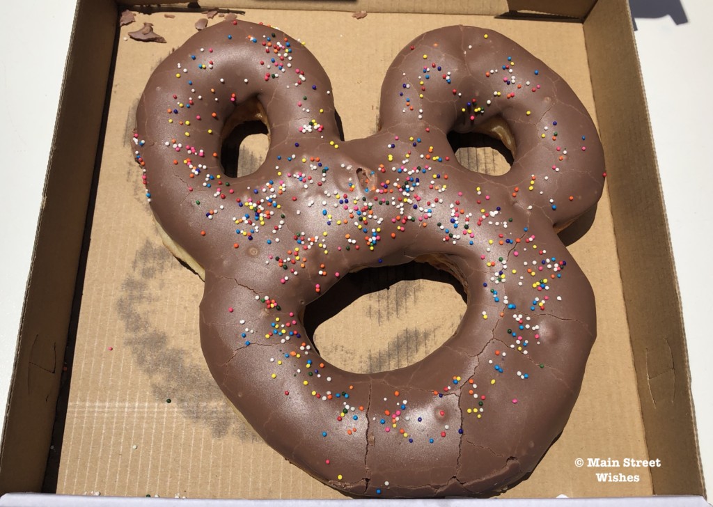 The donut is in the shape of Mickey’s head and it’s huge! This is definitely a sharing treat. I bought one last weekend to share with my friends and it was more than enough. It’s served to you in a box, so you can easily take it with you back to your room. I carried it in a bag, so it didn’t always stay upright, but it was fine when I took it out of the bag. The box is pretty sturdy and helps to protect the donut.