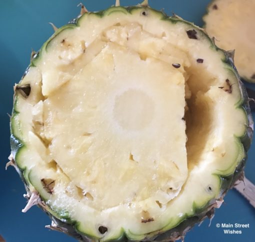 I started by cutting off the tops of the pineapple, that would be the top for the drink. Then I started coring the pineapple. It wasn’t too bad getting the pineapple out, but it would be much easier to have a pineapple corer. I am going to purchase one, because I know this will not be the last time we make our own Lapu Lapus.