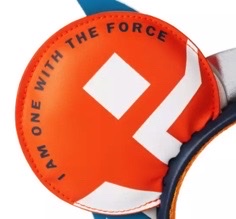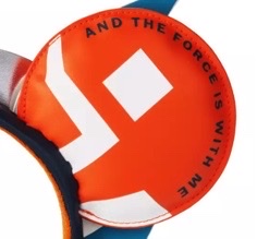 The ears are padded and covered in an orange faux leather material. The back of the ears both have screen art on them. The right ear says “I am one with the Force” and the left ear says “and the Force is with me.