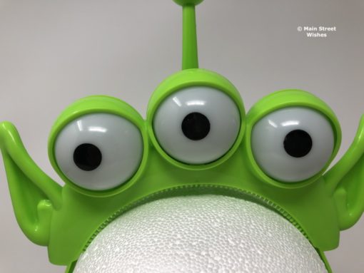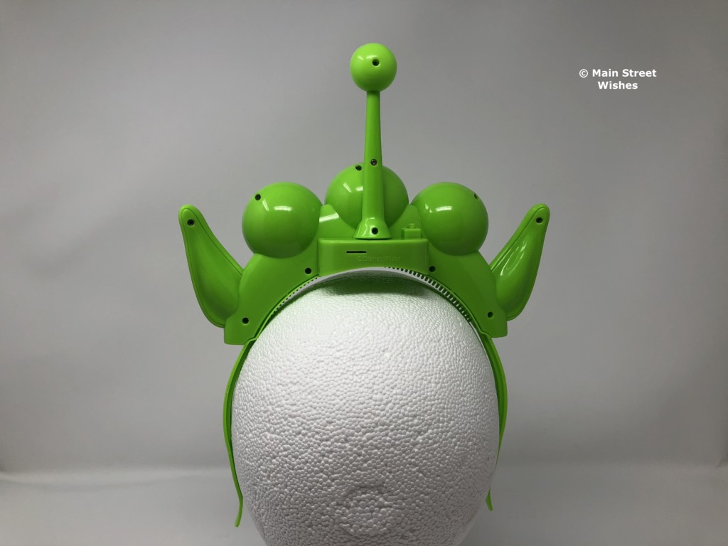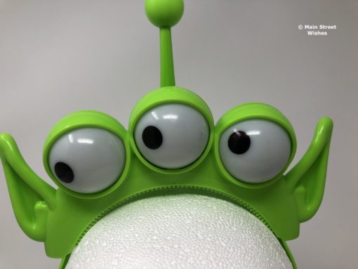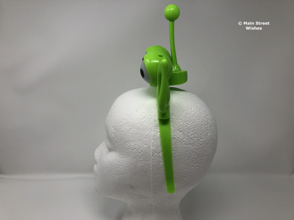 On top of the headband are the ears, the eyes, and the antenna. The ears are shaped like the aliens’ ears in the Toy Story movies. They are plastic, like the rest of the headband, so they cannot be moved at all.