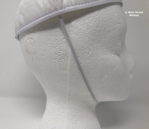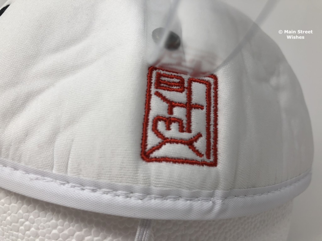 These ears are simple, but still very cute. The hat is made of felt, so it is very soft, just like Baymax. Also on the hat are Baymax’s eyes. So there are two black circles connected by a single straight line, which is how his eyes look in the movie. Another feature on the hat are symbols on the side under one of the ears. In addition, there is a chin strap attached to each side of the hat to help keep it on your head.