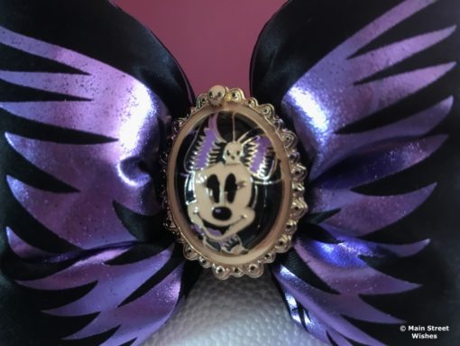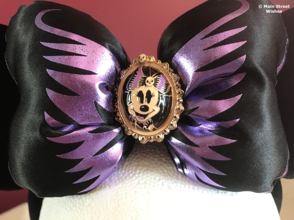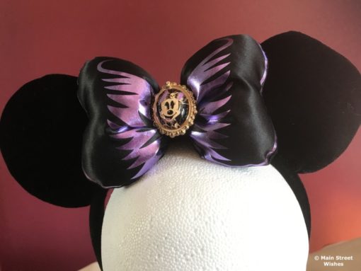 The bow on the head band has a smooth satin feel too it. The bow is black with some purple detailing on the front of the bow and also outlining the bow. In the middle is the cameo (hence the name of the headband) and it has a picture of Minnie on it. In the the picture she is wearing the same purple and black bow, but instead of her picture in the middle she has a skull in the middle of her headband.