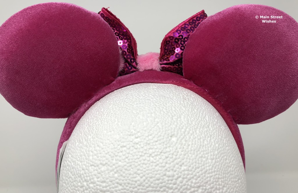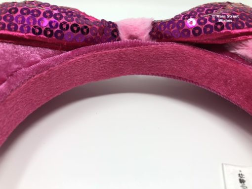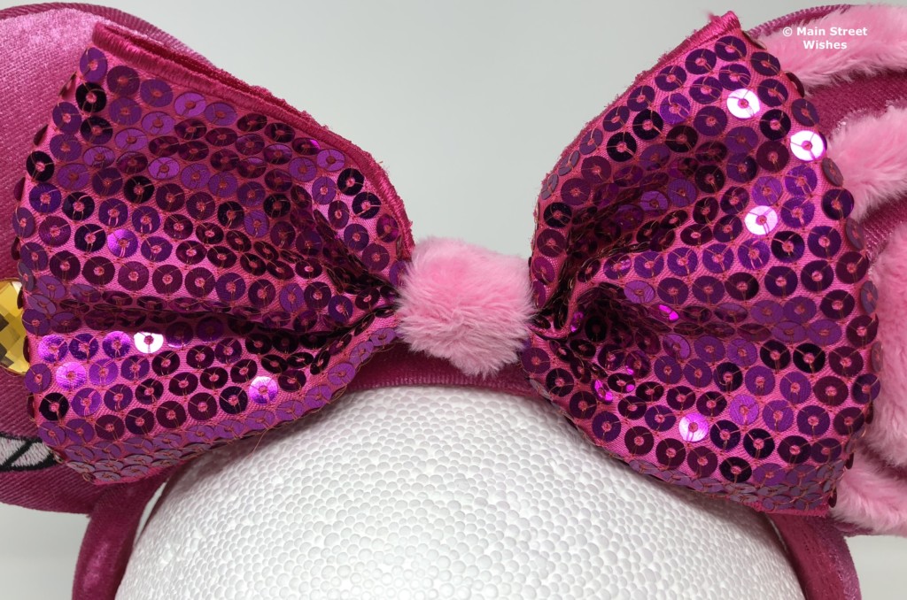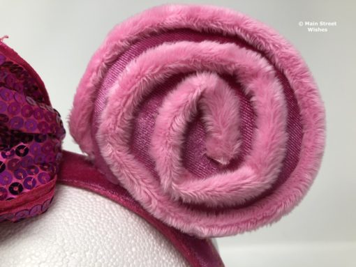 The bow is made of a satin-like material that is covered in purple/pink sequins. The color of the bow is darker than the color of the ears. In the middle of the bow is the same fuzzy material that is swirled around one of the ears.